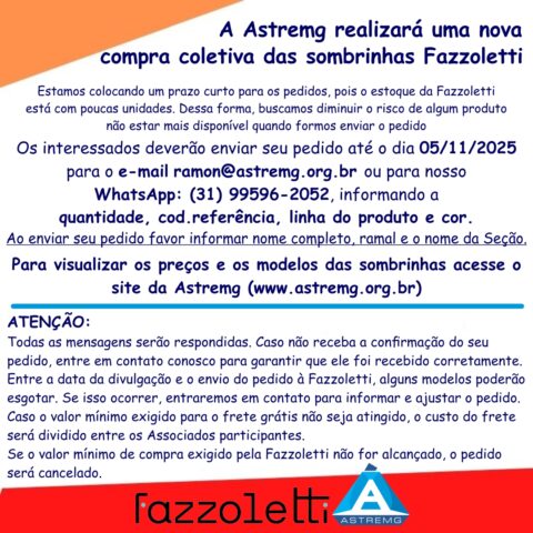 Leia Mais ...NOVA COMPRA COLETIVA DE SOMBRINHAS FAZZOLETTI A ASTREMG realizará uma