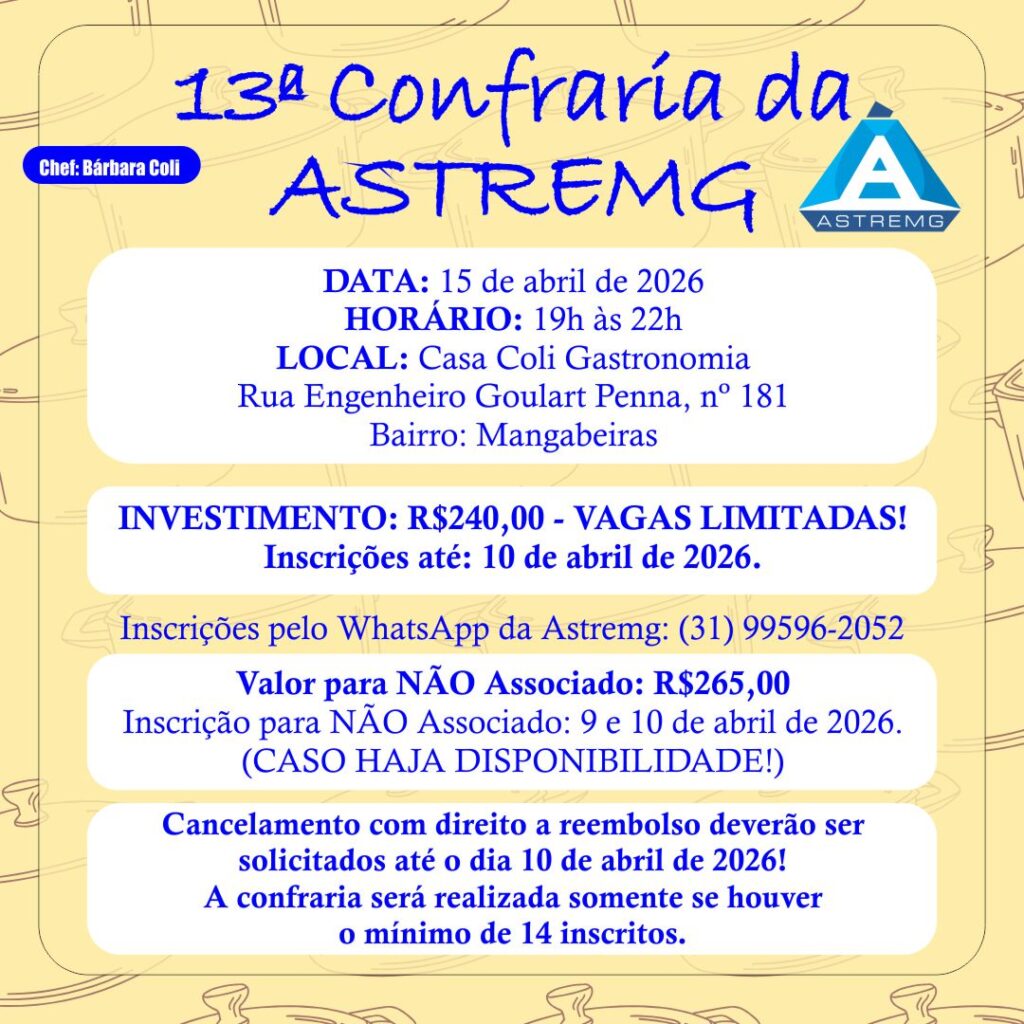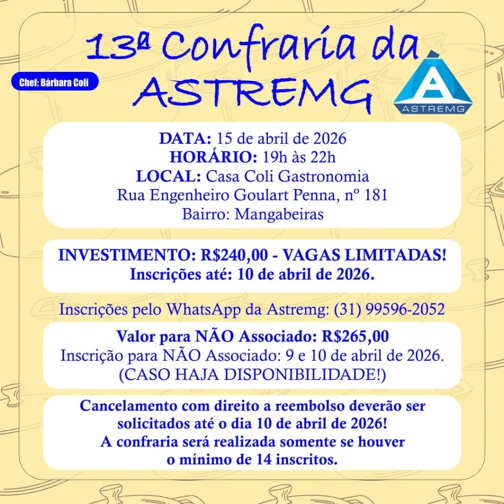 A ASTREMG convida você para a 13ª edição da Confraria, um encontro especial que reúne boa gastronomia, confraternização e momentos agradáveis entre
