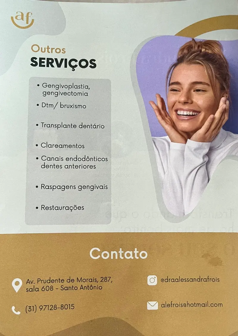 Descontos de 20% nos serviços de implantes, protocolo sobre implantes, clareamentos, extrações, gengivoplastia, frenectomia, raspagem subgengival, limpeza, restaurações, placa de bruxismo e limpeza de protocolo.