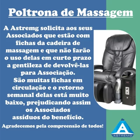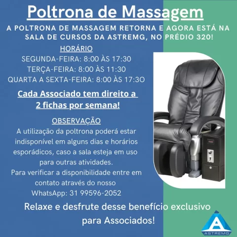 A Poltrona de Massagem retorna e agora está na sala de Cursos da ASTREMG, no prédio 320! Ajude sua Associação. Não repasse